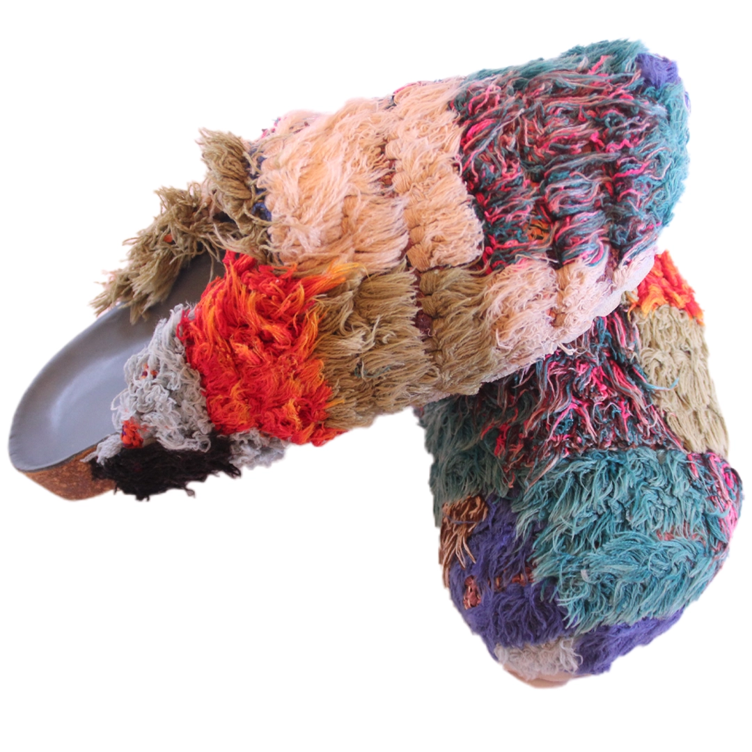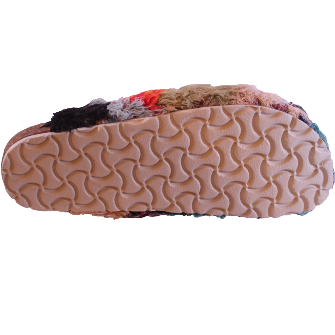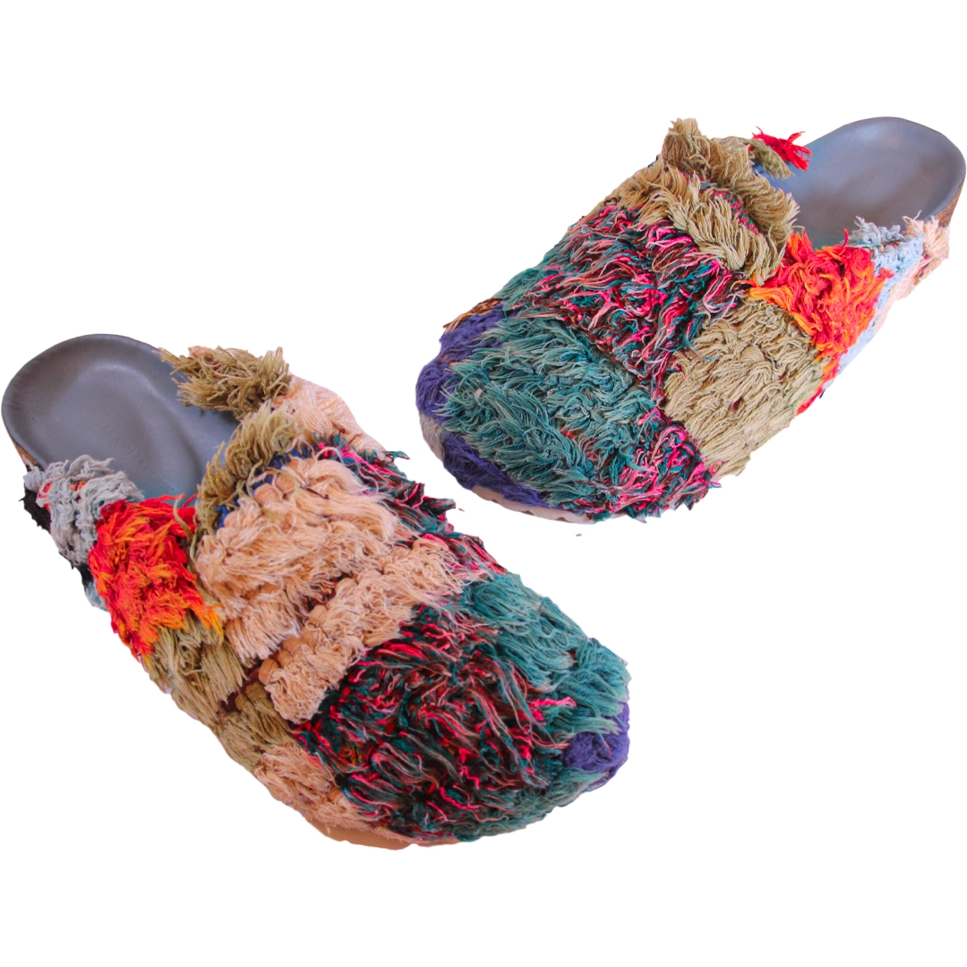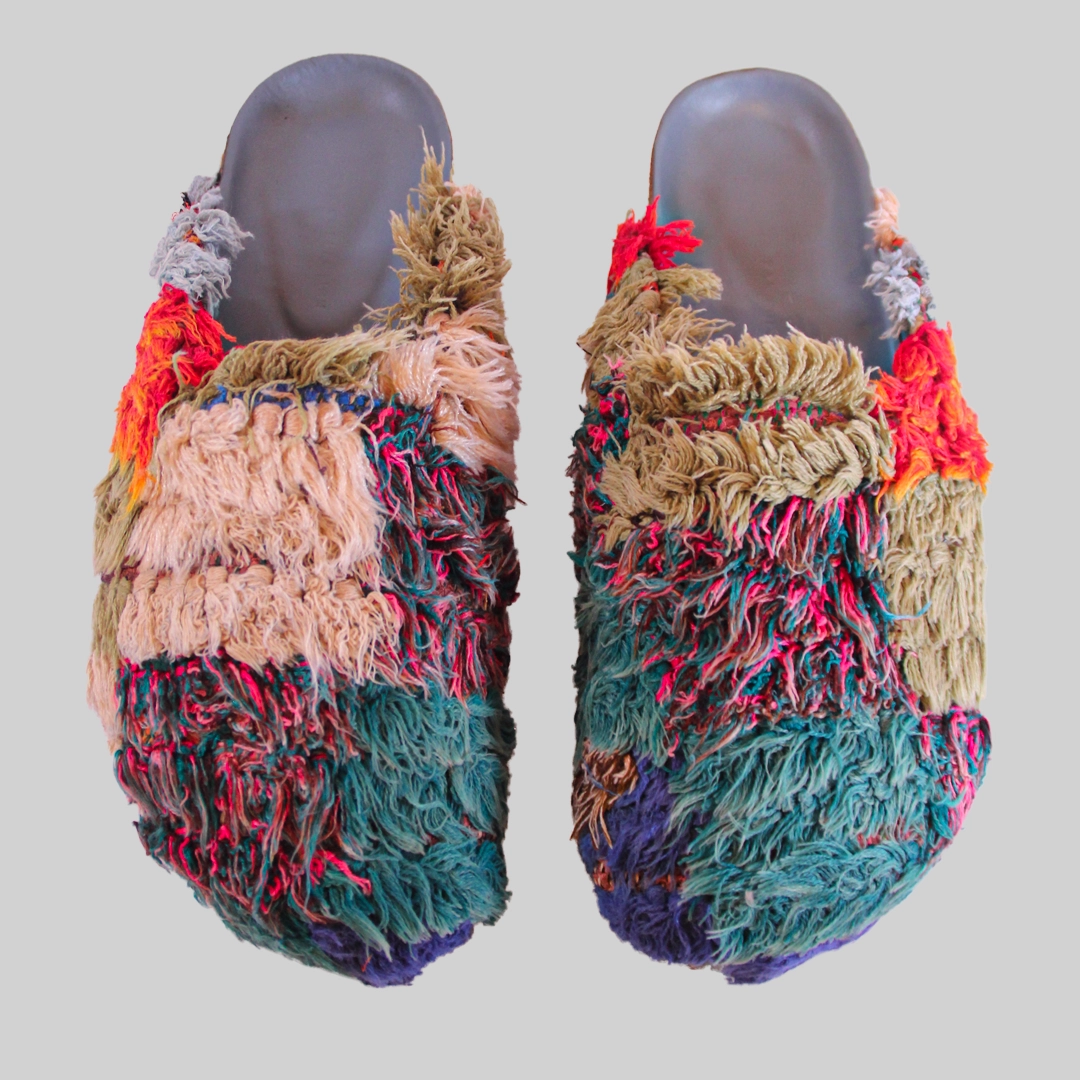 These artisanal clogs are handcrafted from authentic Moroccan Boucharouite fabric, a traditional textile created from recycled woven materials, celebrated for its vibrant colors and unique textures. Each pair is truly one-of-a-kind, reflecting the creativity and eco-friendly spirit of Moroccan craftsmanship.